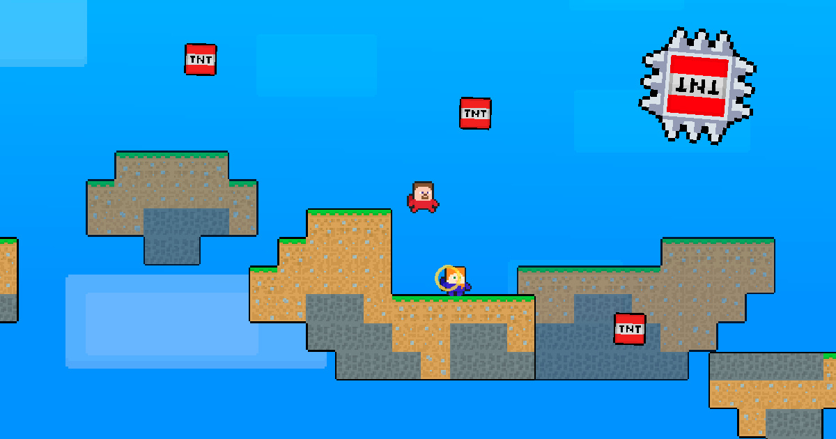 There are 2 astronauts who need to survive in the world of skyblock, one of them is steve and alex. Help two fellow astronauts and make them reach the portal or they may lose. There are dangerous tnt rocks and rotating sharp tnts everywhere in the world of skyblock, they can kill you if you leave the safe zone, you will die, be very careful. Collect 3 gold bars with your friend and one of you will reach the portal.